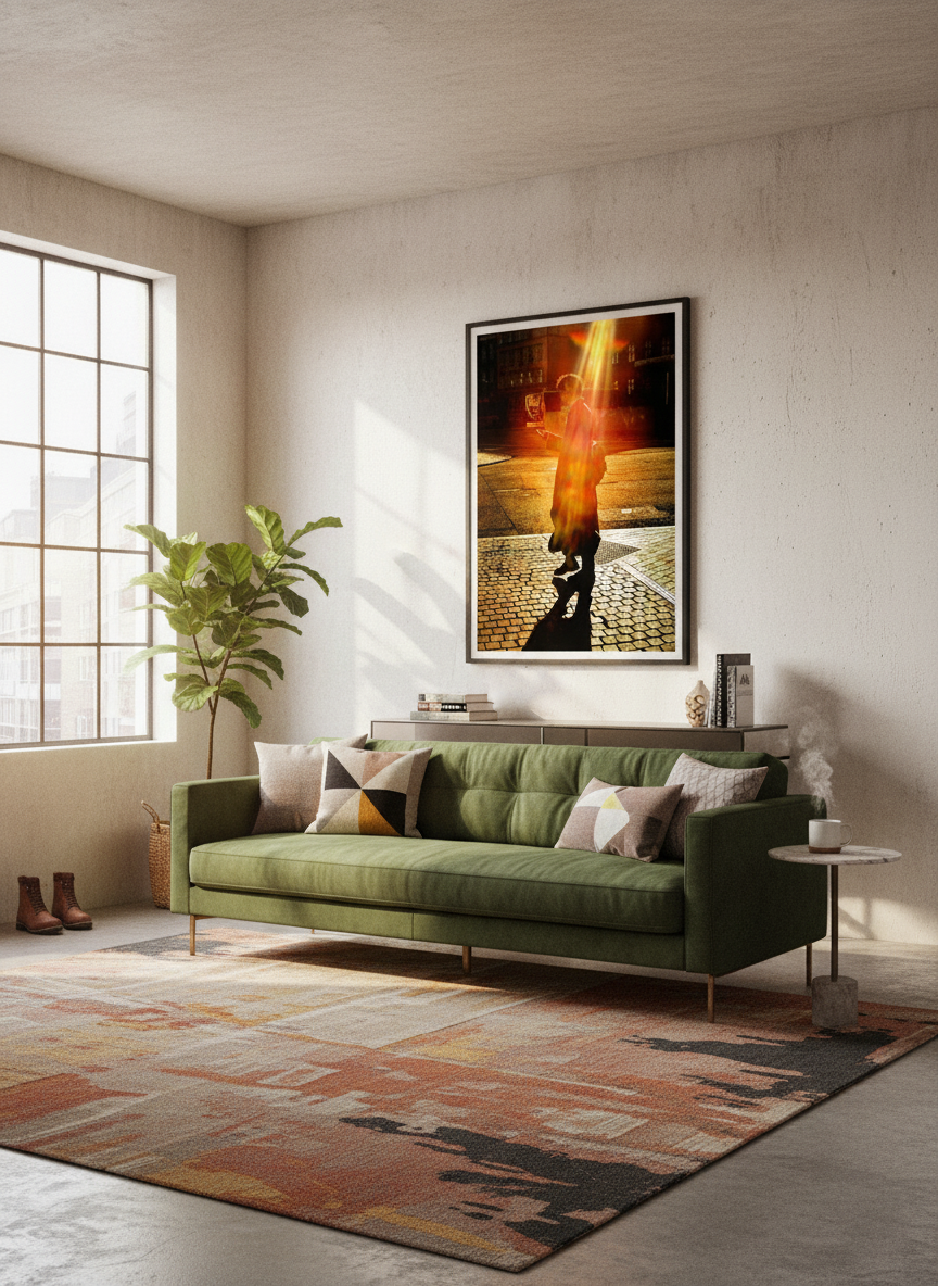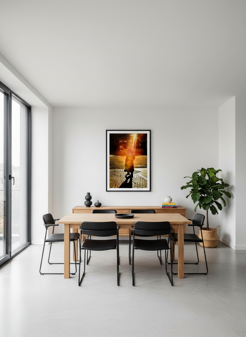 Beam yourself to a vibrant, almost otherworldly moment in Copenhagen with ‘Beam Me Up, Scotty!’, a captivating fine art print by art photographer Brian Andersen. Captured near the bustling Nørreport Station, this image transcends traditional street photography, infusing a familiar urban scene with a surge of radiant energy.
