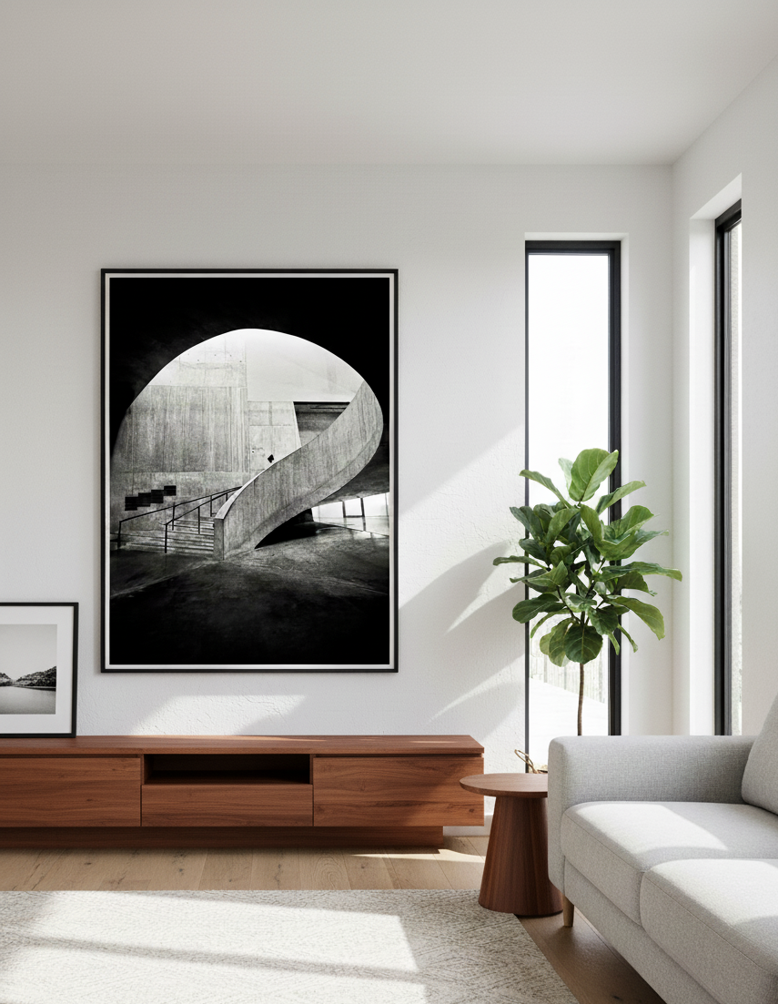 ‘Descending’, captured by photographer Brian Andersen in London in March 2024, captures the dramatic interplay of light and shadow. This piece is a study of the brutalist architecture and geometry of the Tate Modern. It explores the raw, monolithic beauty of the gallery’s famous staircase, as it spirals out of the darkness. A solitary silhouette descends the staircase, surrounded by a massive space of tactile, concrete walls and cold steel railings.